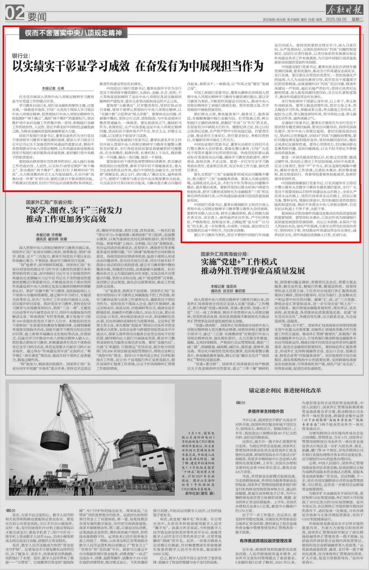 今天(2025年8月5日)的《金融时报》以《银行业:以实绩实干彰显学习成效 在奋发有为中展现担当作为》为题,报道银行业金融机构开展学习教育有关情况。报道对国家开发银行党委书记、董事长赵欢为全行党员干部讲授学习教育专题党课的情况作了介绍。