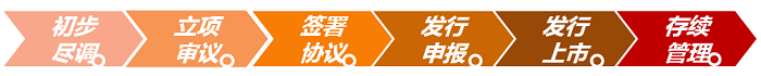 初步尽调,评估项目可行性;通过立项审议,签署承销协议;项目启动,对客户进行尽职调查;按主管部门要求的债券申报材料标准格式制作完成全套申报发行材料;各中介机构完成项目内核程序;向证监会、交易所等机构提交申报材料;完成预审核流程后,获取注册文件/或无异议函;债券发行、上市(非公开发行的,发行后需进行备案);存续期管理,完善信息披露。