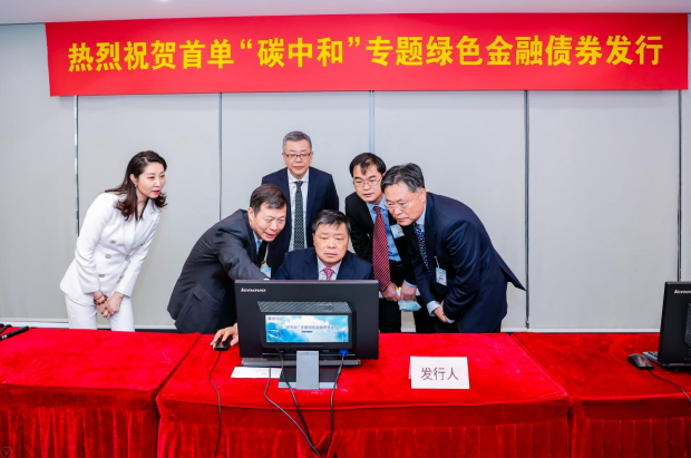 图1:国开行党委副书记、行长欧阳卫民,党委委员、副行长周学东,与人民银行、上海清算所、外汇交易中心代表现场见证首单“碳中和”专题绿债发行。
