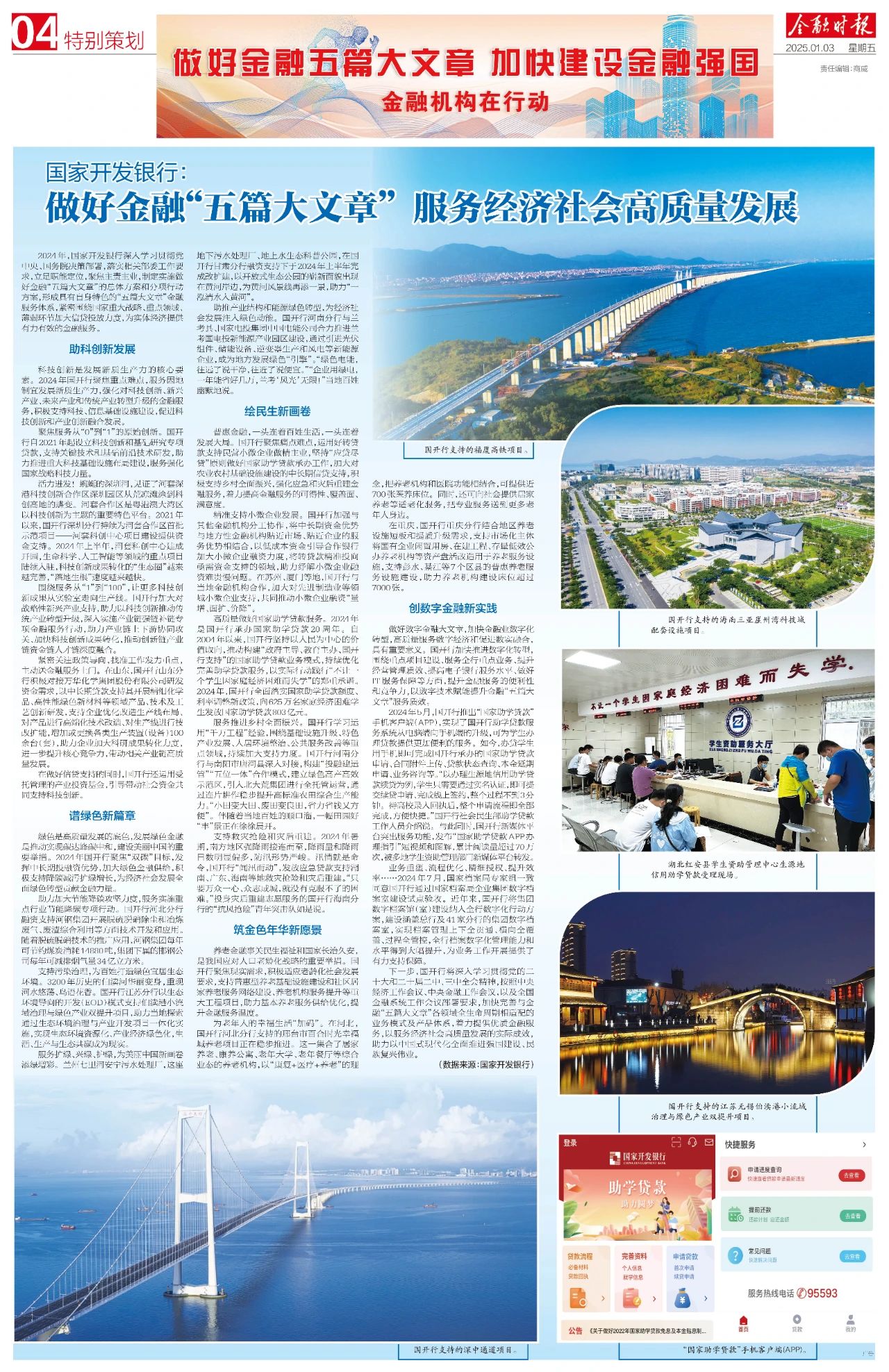 2024年,国家开发银行深入学习贯彻党中央、国务院决策部署,落实相关部委工作要求,立足职能定位,聚焦主责主业,制定实施做好金融“五篇大文章”的总体方案和分项行动方案,形成具有自身特色的“五篇大文章”金融服务体系,紧密围绕国家重大战略、重点领域、薄弱环节加大信贷投放力度,为实体经济提供有力有效的金融服务。