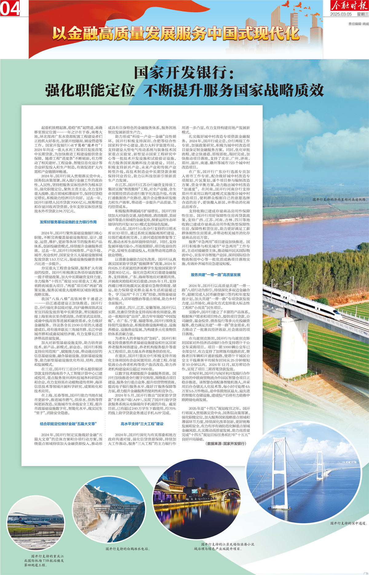 夯实重大工程资金保障,服务扩大有效益的投资。国开行积极落实各项存量政策和一揽子增量政策,加大中长期融资支持力度,全力服务“十四五”规划102项重大工程、跨省跨流域重大项目、“两重”项目和“两新”政策实施,服务区域重大战略和区域协调发展战略实施。